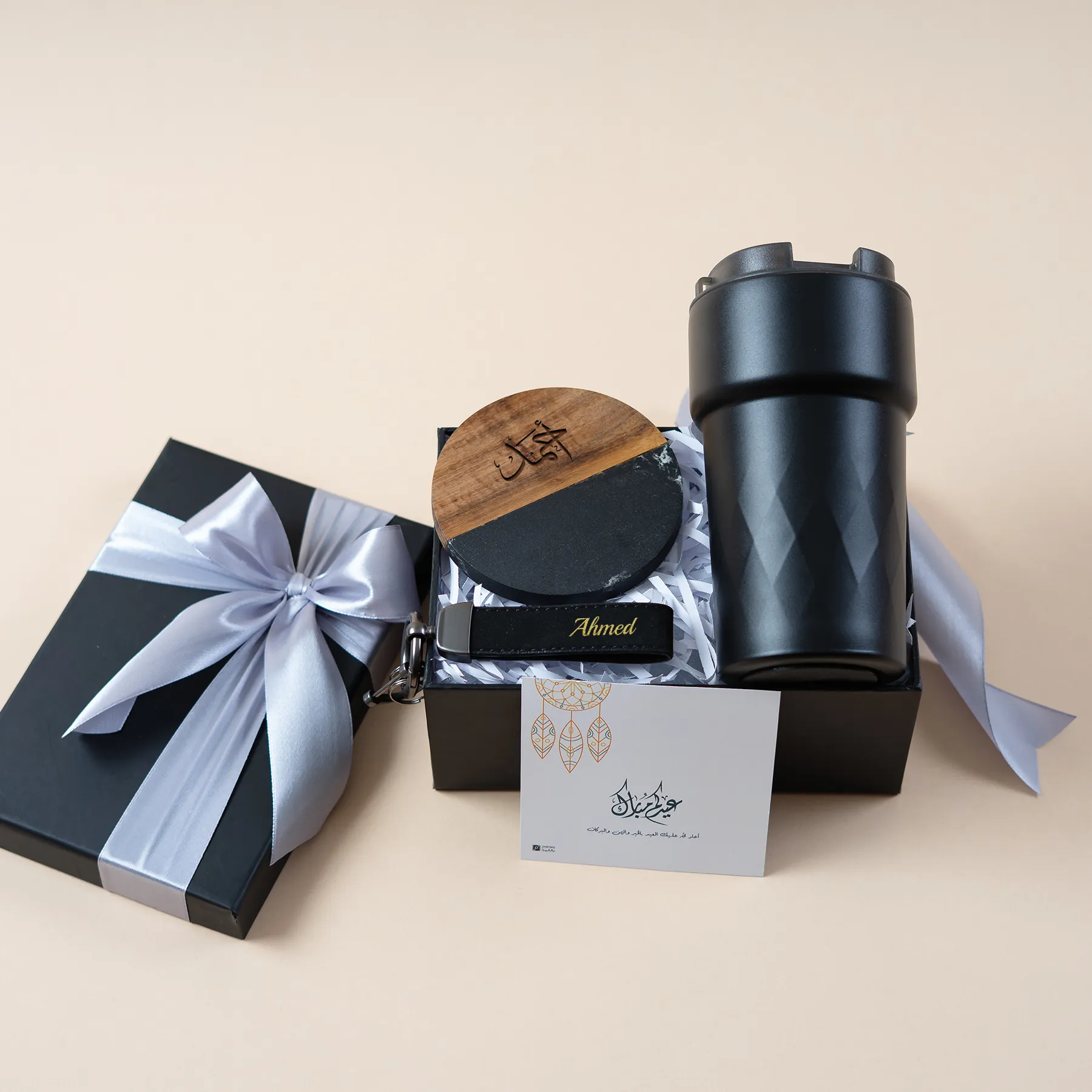 “هدية تليق بـ ملوك القهوة! حافظة حرارية سوداء تحافظ على سخونة أحلامهم، وكوستر سيراميكي يحمي طاولتهم من آثار الحياة وميدالية فاخرة تلمس قلوبهم قبل أياديهم.