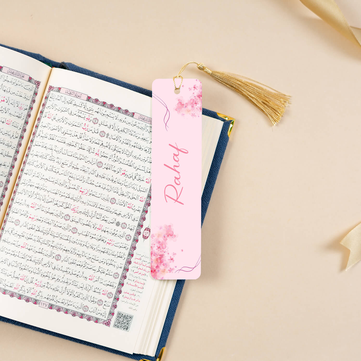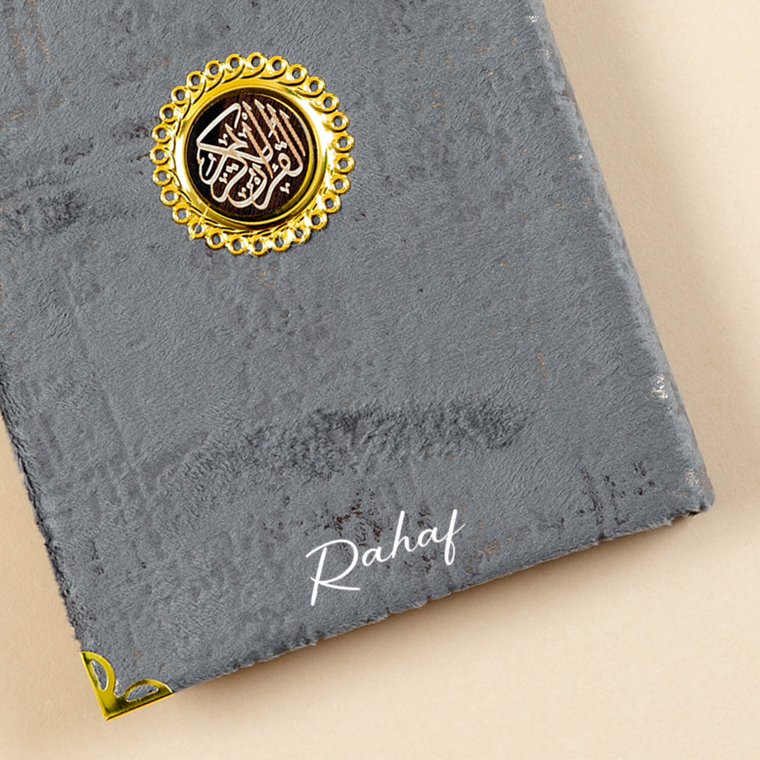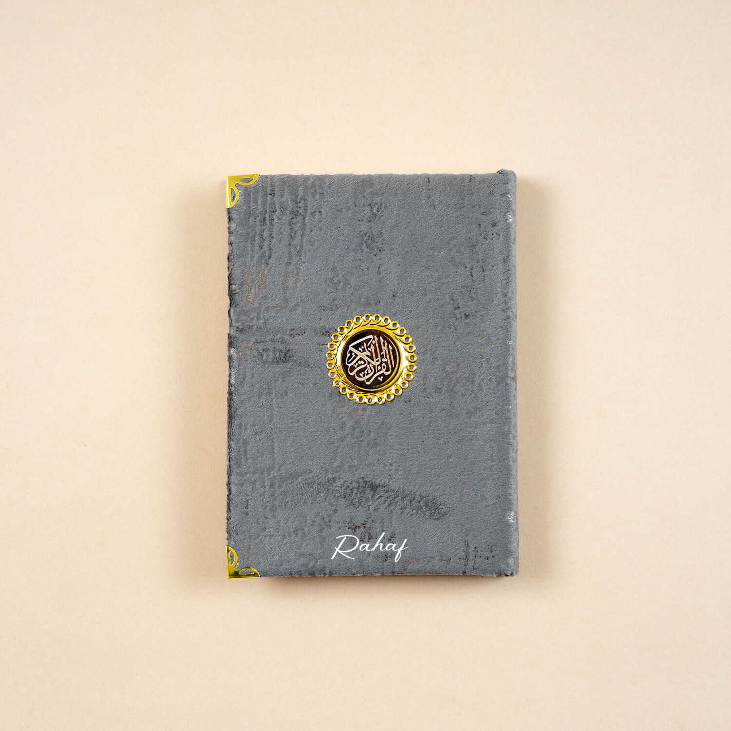 - مصحف متوسط الحجم بغلاف قماشي فاخر مع طباعة الاسم عليه