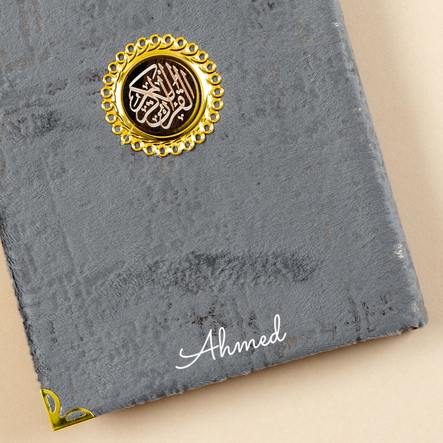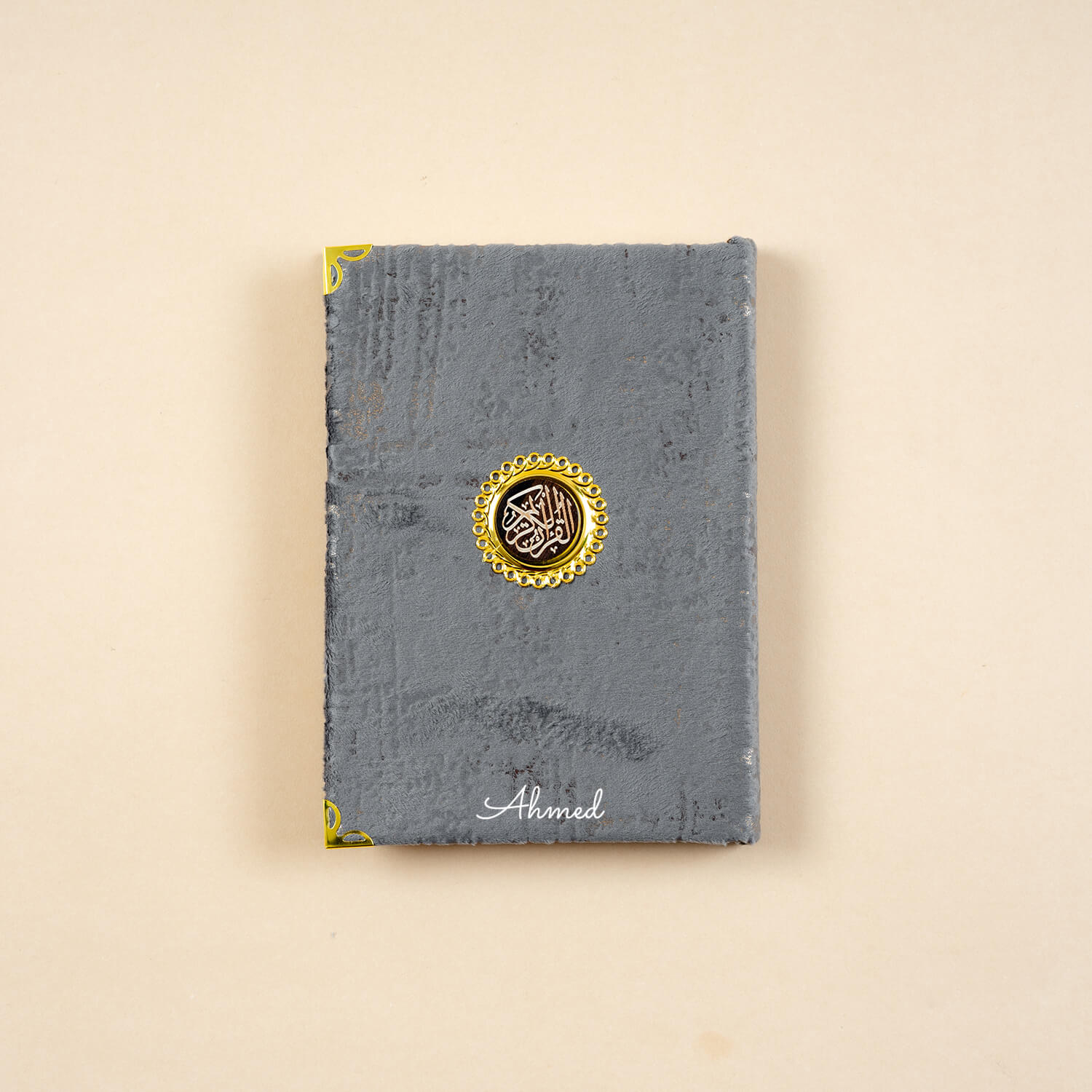 • مصحف متوسط الحجم بغلاف قماشي فاخر مع طباعة الاسم عليه